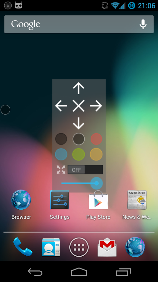 With this button you can decide when and how turning off your cell phone screen. Don't worry is very discrete and include options to change the position, color, transparency and size.